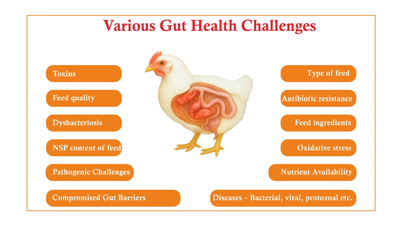 Optimal gut health is important for performance and production in poultry. There is a direct co-relation between animal performance and a 'healthy' gut. Gut/ intestine performs various functions i.e. nutrient digestion, metabolism and absorption, energy production, a stable microbiome, mucus layer development, barrier function and mucosal immune responses. The most basic function of the gut is regulating physiological homeostasis that provides the host the ability to withstand infectious and non-infectious stressors. Quality of feed, feed ingredients, pathogens & overall health status adversely impacts gut health balance & impacts performance severely.