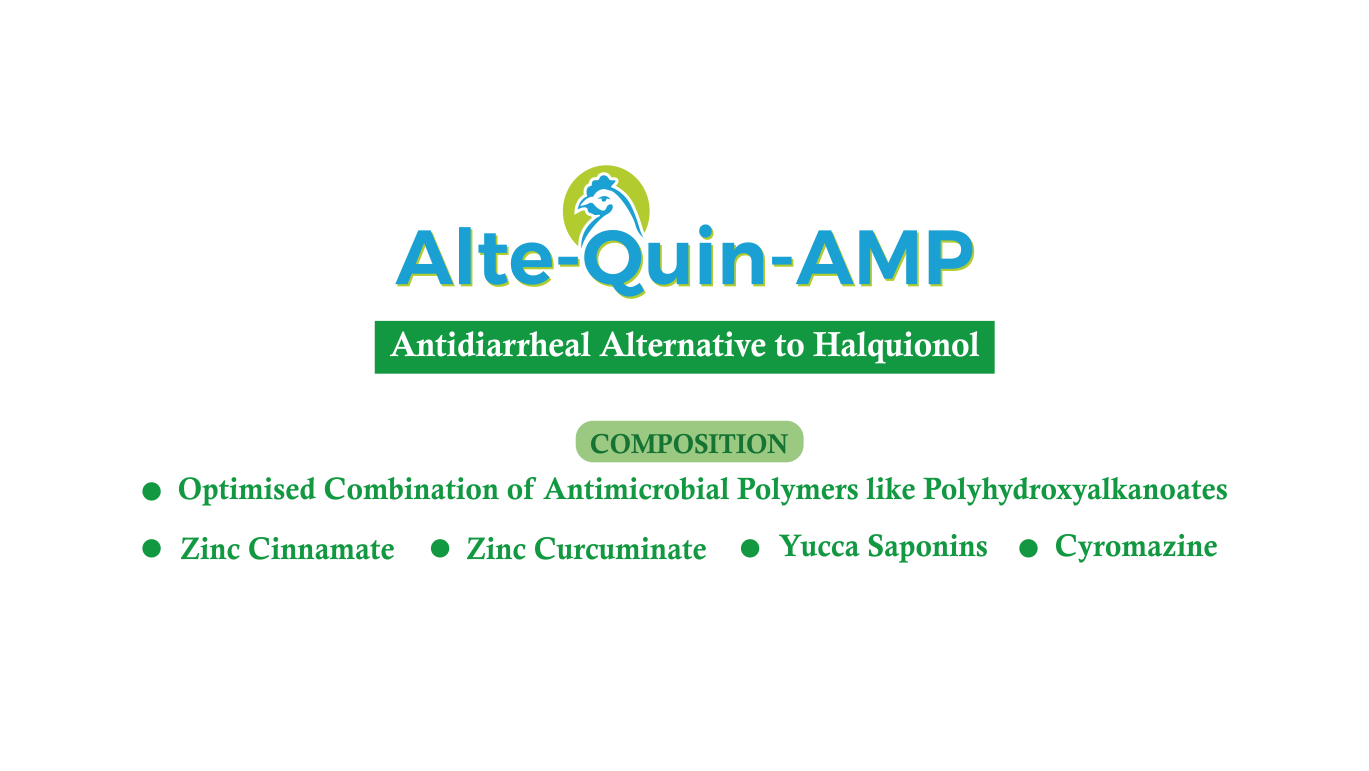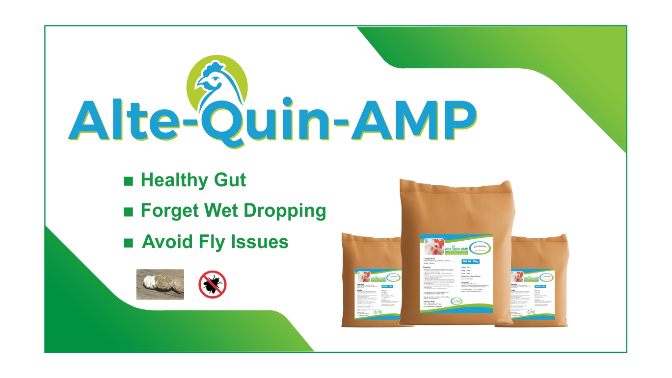 - Alte-Quin-AMP lowers down of peristaltic movement helps in better assimilation of proteins, allowing lower protein input in the diet which in turn results into less nitrogen loss in droppings and less ammonia in air.